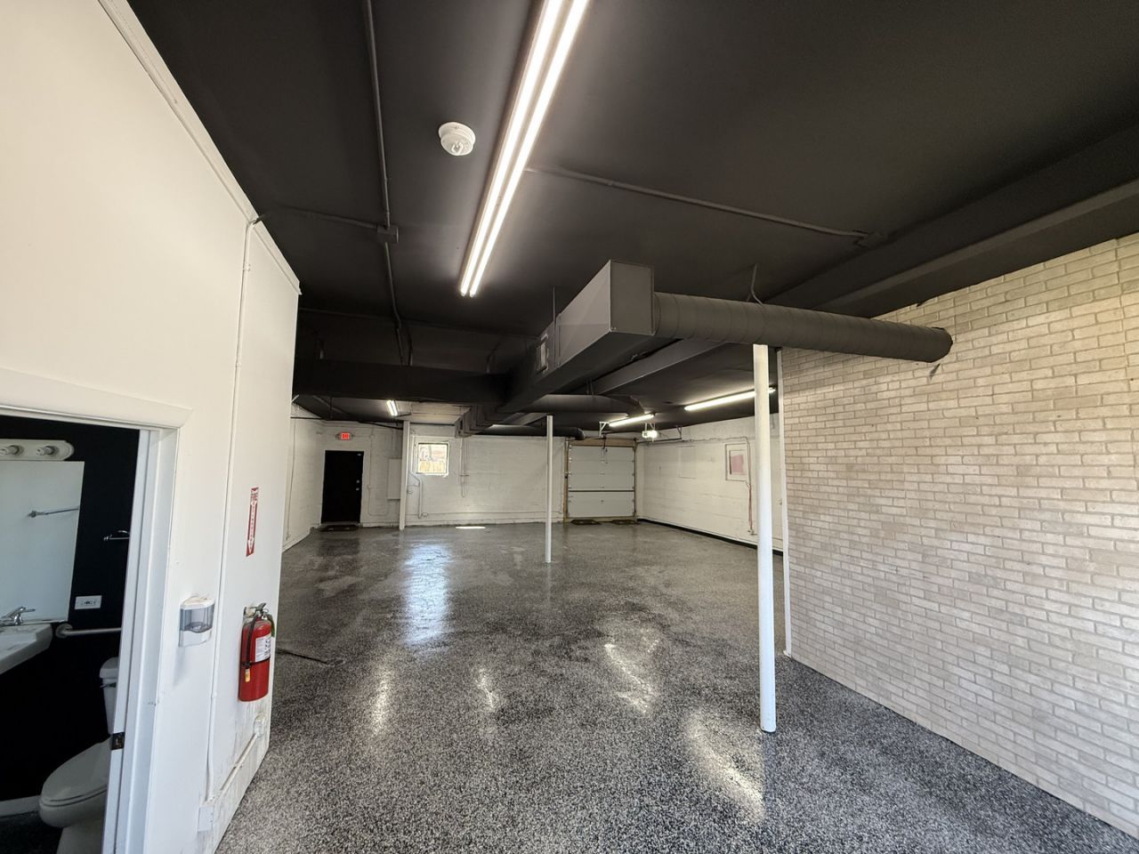 Spacious open floor plan, ideal for an entrepreneur's warehouse or office setup. Back door has been converted to a garage door to be able to bring cars inside the building. The open layout offers flexibility for office space and more. A small office is located to the right(front), with a bathroom to the left. There is ample parking at the rear and a driveway along the side of the building. Dimensions: Main Room: 414 (Length) x 399 (Width) Office: 157 (Length) x 150 (Width) Bathroom: 88 (Length) x 53 (Width)